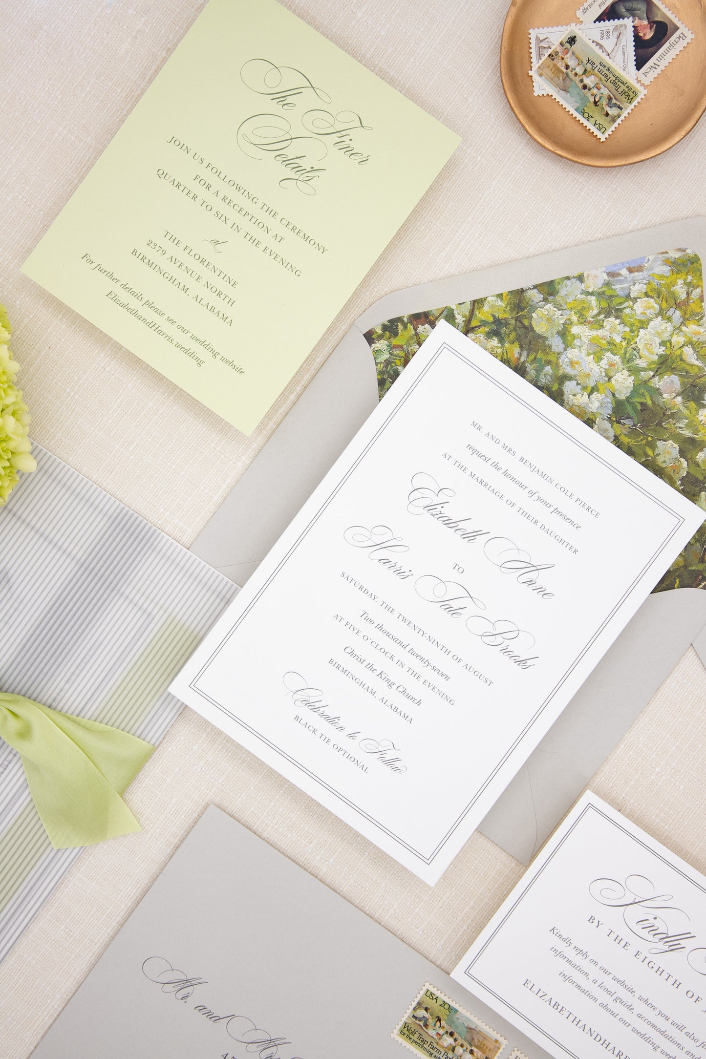 At Mads Studio & Co., we design timeless custom wedding invitations and wedding stationery rooted in classic design and thoughtful tradition. Based in South Carolina, we work with couples throughout Alabama, Georgia, and nationwide to create paper goods that feel personal, well made, and enduring. Every detail is considered with care, from typography to materials, resulting in wedding stationery that reflects your story and sets the tone for a celebration that feels welcoming, intentional, and lasting.
