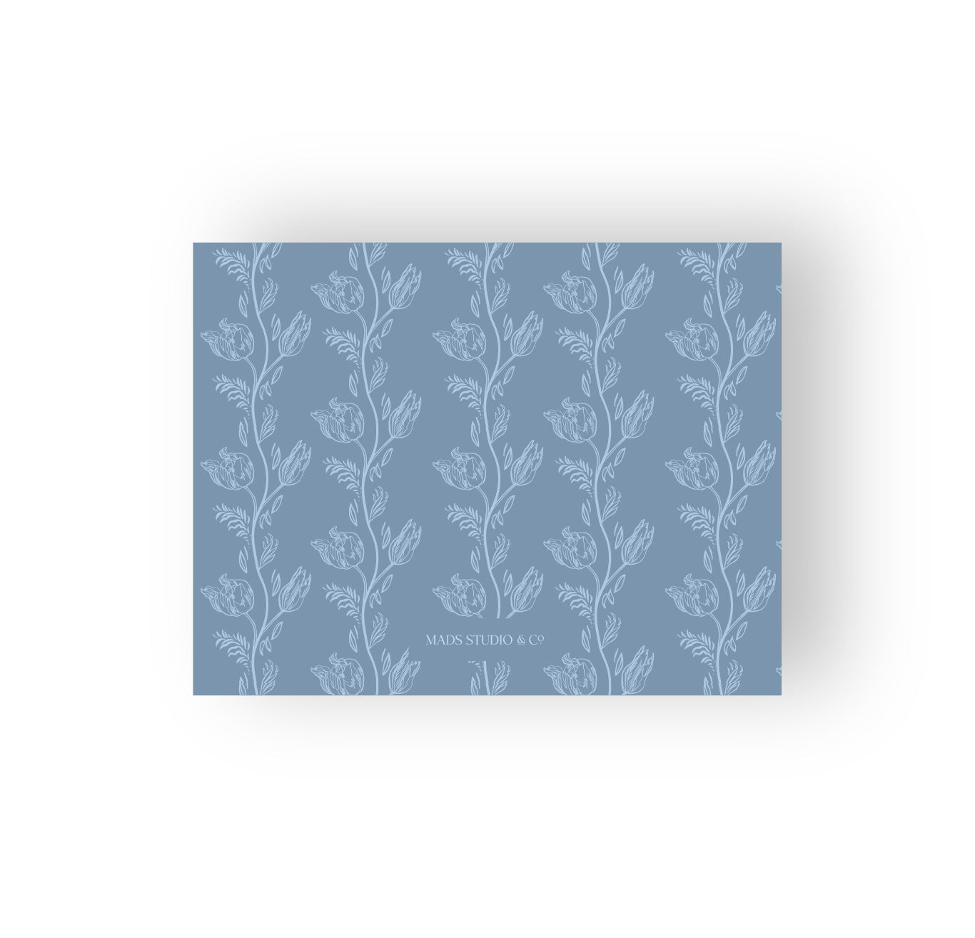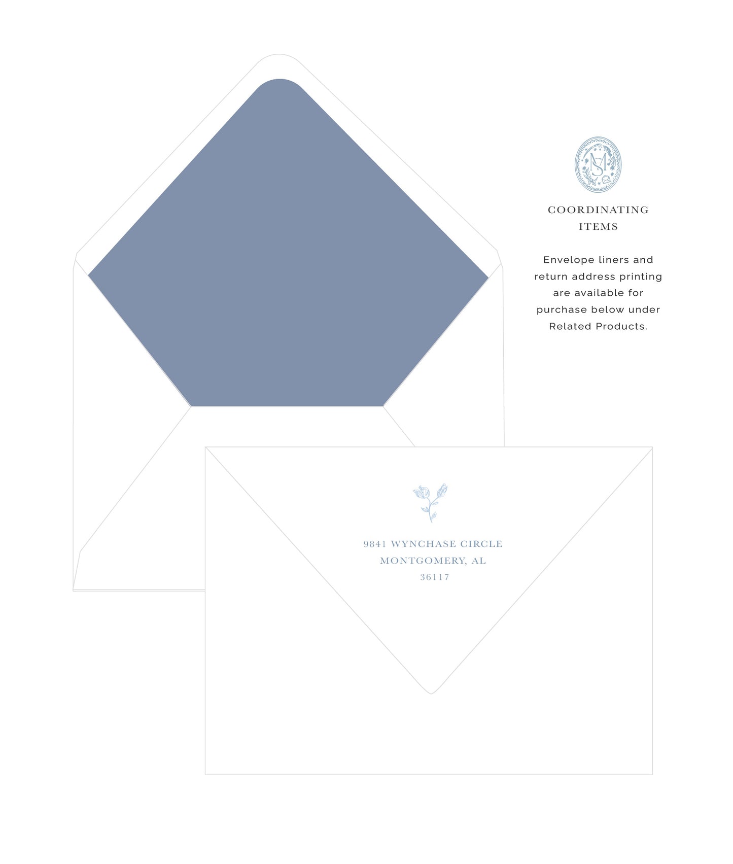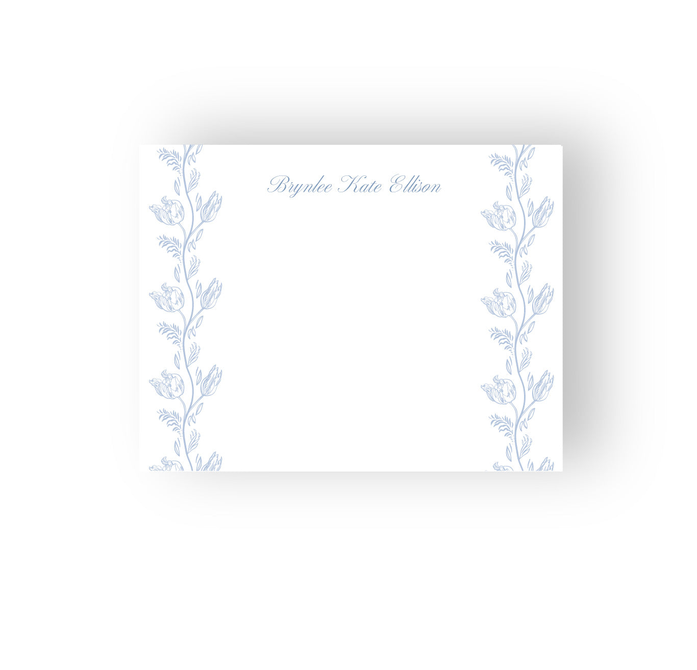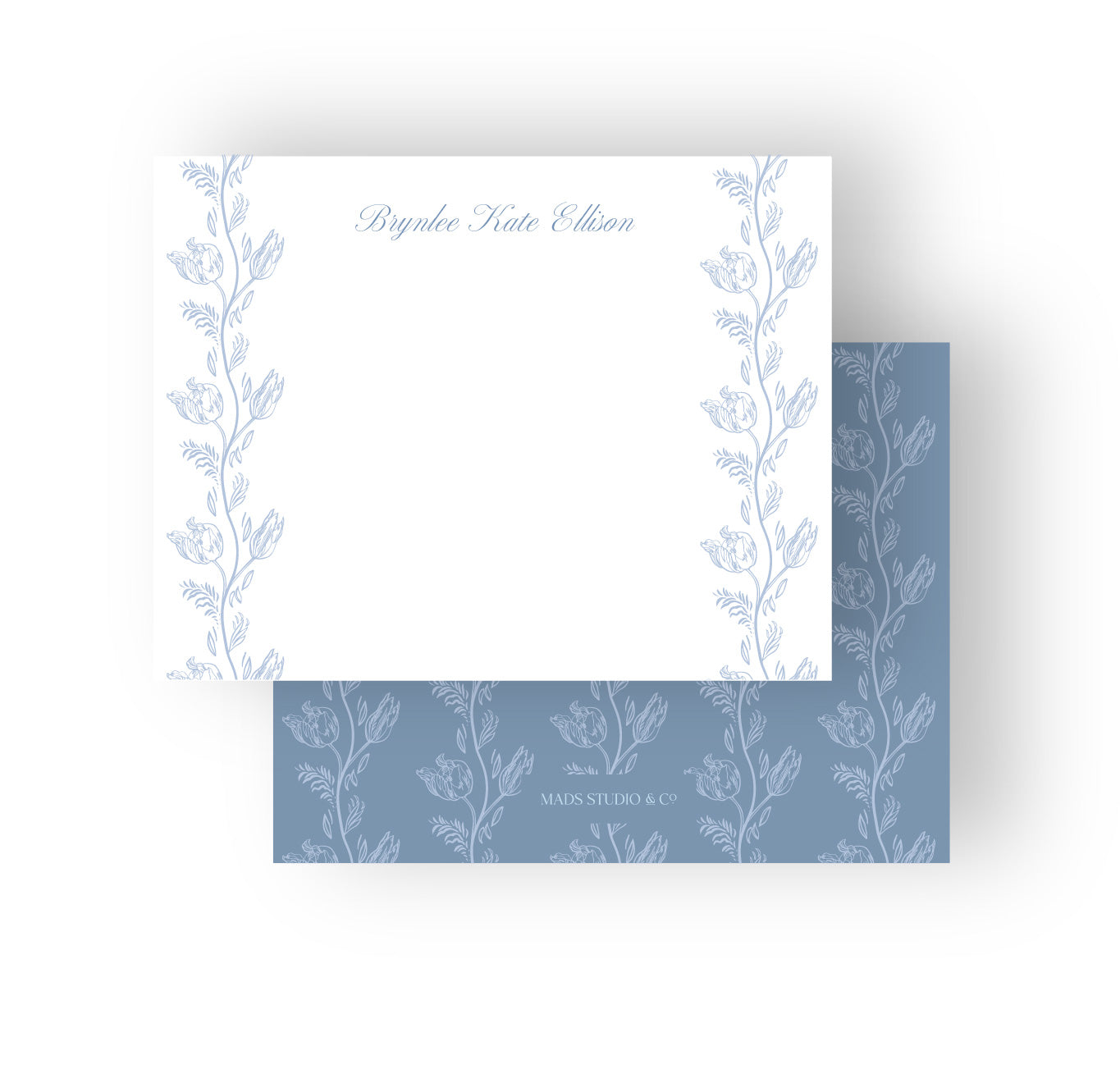 Delicate vines gracefully frame your note in this classic design. Featuring soft powder blue botanicals and elegant personalization, the Brylee Blue Vine set is a timeless choice for any occasion. The coordinating reverse pattern adds a tailored finishing touch.