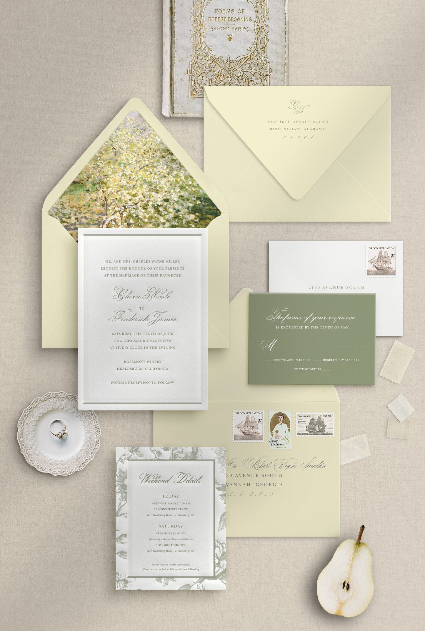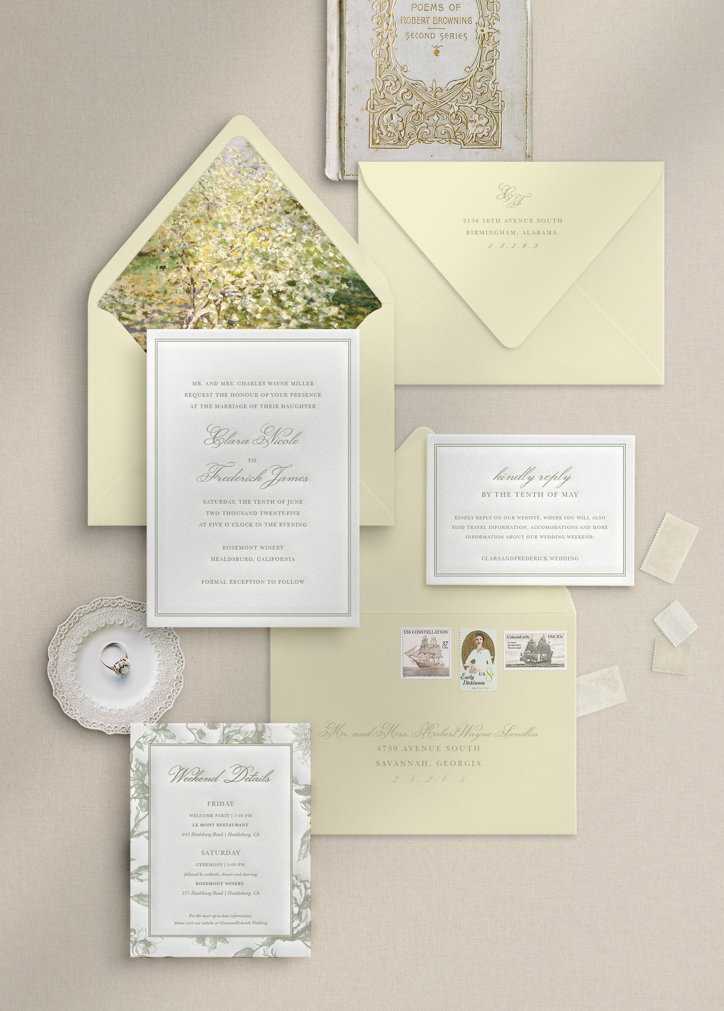 Soft, romantic, and quietly elegant, the Clara Suite is inspired by heirloom details and a love of timeless paper goods. Featuring delicate botanical artwork and graceful typography this suite feels classic without feeling formal or heavy.