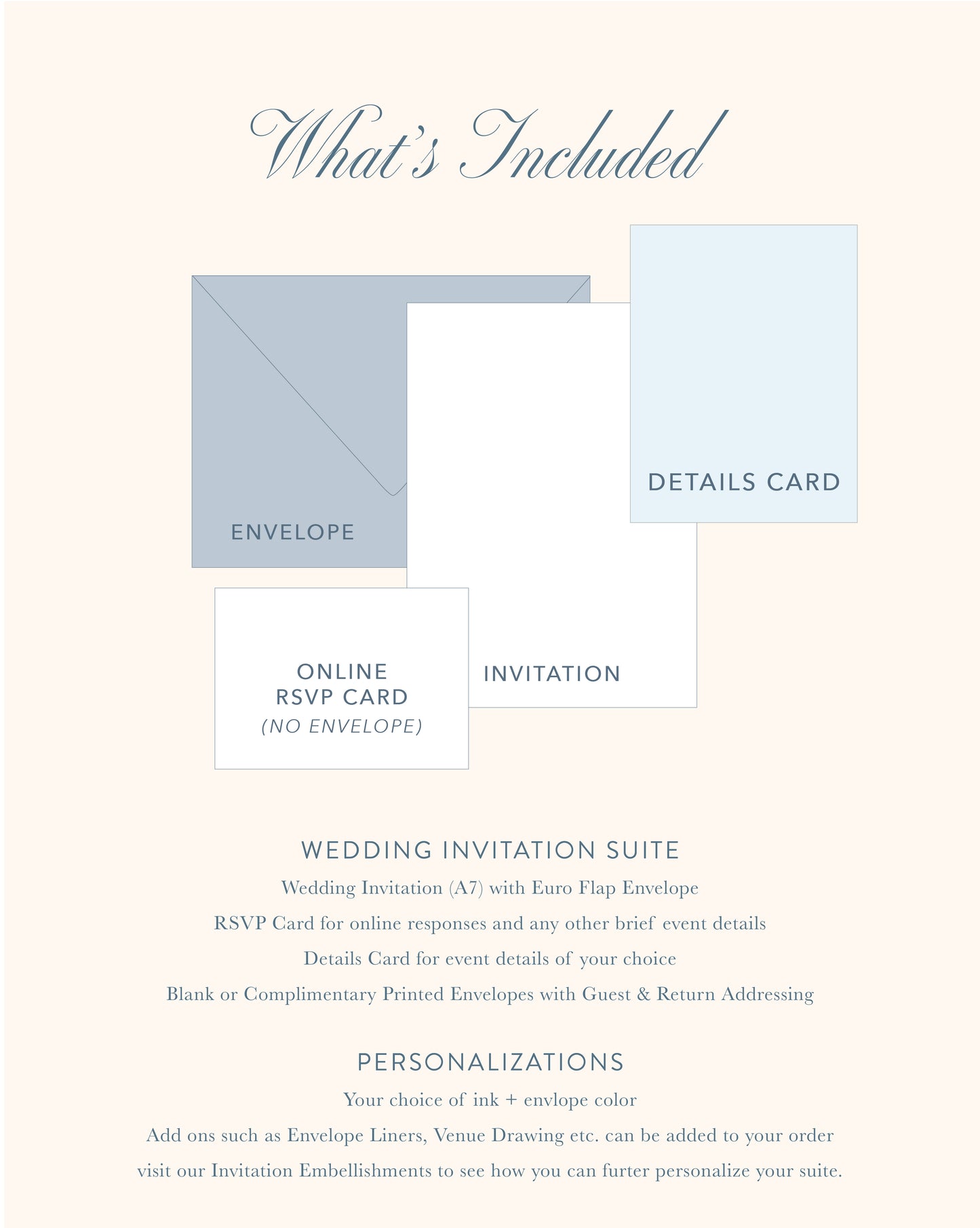 The Clara Suite — a softly romantic design that embodies timeless elegance and refined detail. This suite features delicate botanical artwork, translucent vellum wrapping, and classic typography that feels both graceful and enduring. Thoughtful layers—from the vellum overlay and wax seal to the coordinating inserts and envelopes—create a presentation that is understated yet beautifully intentional. Rooted in tradition with a light, airy sensibility, the Clara Suite offers an heirloom-quality design that will preserve the beauty of your wedding day for years to come.