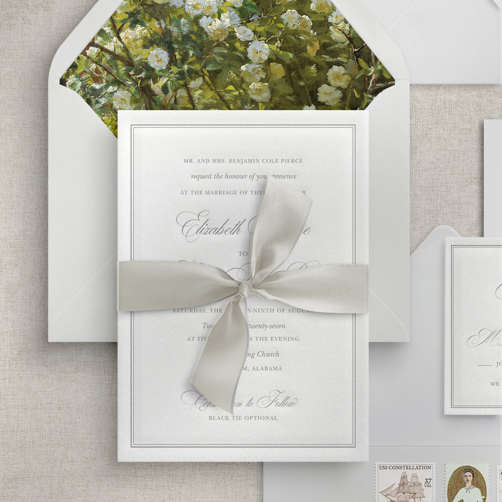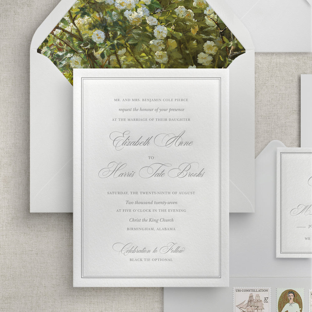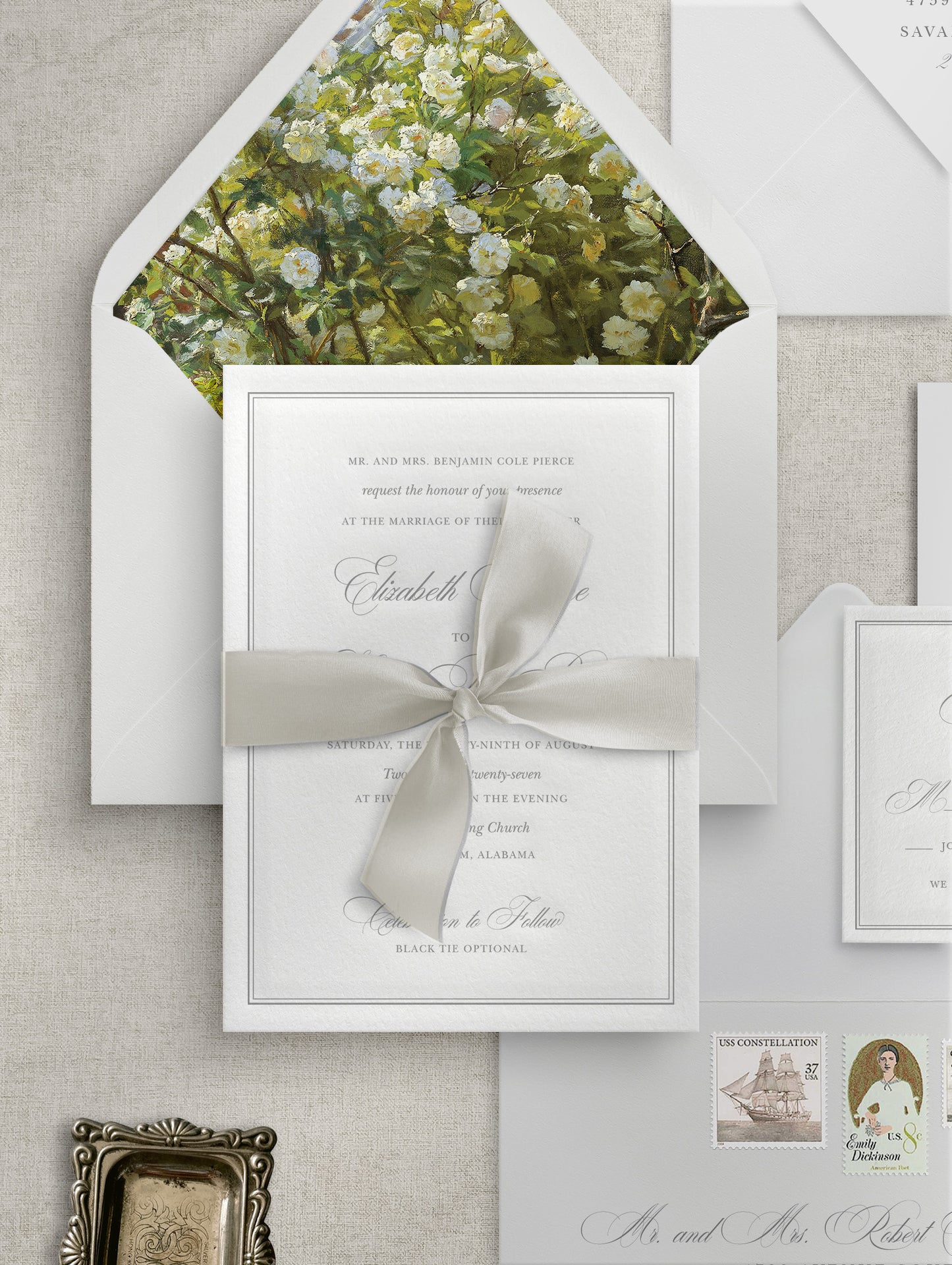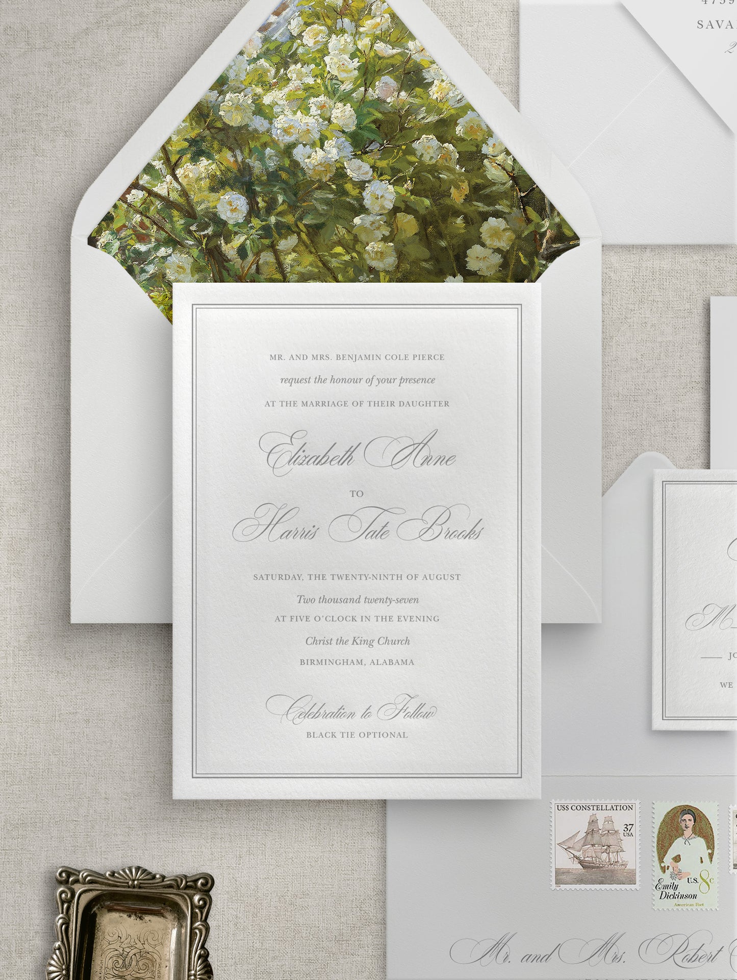 The Elizabeth Anne Suite — a true heirloom design that captures the essence of traditional Southern elegance. This suite features a refined floral envelope liner and a timeless typography. The thoughtful details—from the polished layout to the coordinating inserts—create a keepsake worthy of your most cherished moments. Rooted in tradition yet gracefully versatile, the Elizabeth Anne Suite offers an heirloom-quality presentation that will honor your wedding day for years to come.