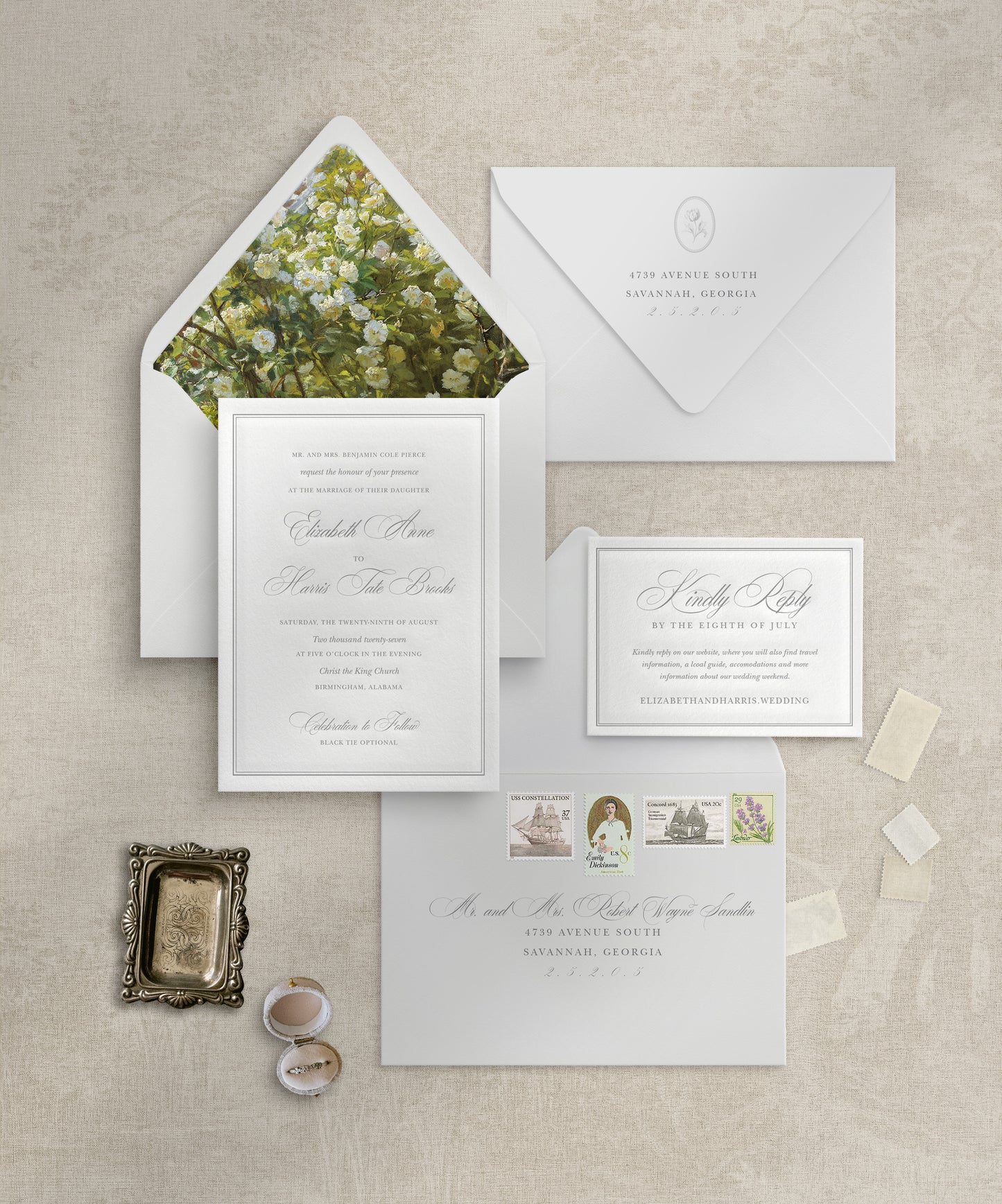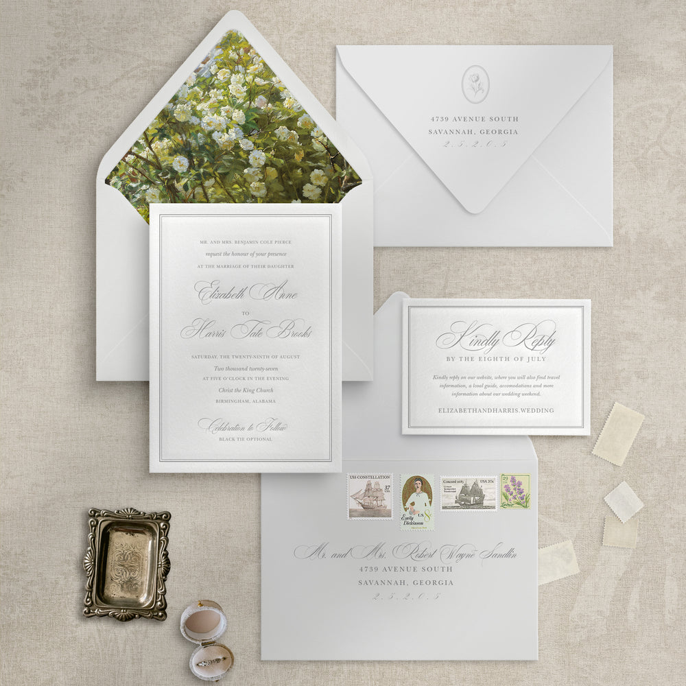 The Elizabeth Anne Suite — a true heirloom design that captures the essence of traditional Southern elegance. This suite features a refined floral envelope liner and a timeless typography. The thoughtful details—from the polished layout to the coordinating inserts—create a keepsake worthy of your most cherished moments. Rooted in tradition yet gracefully versatile, the Elizabeth Anne Suite offers an heirloom-quality presentation that will honor your wedding day for years to come.