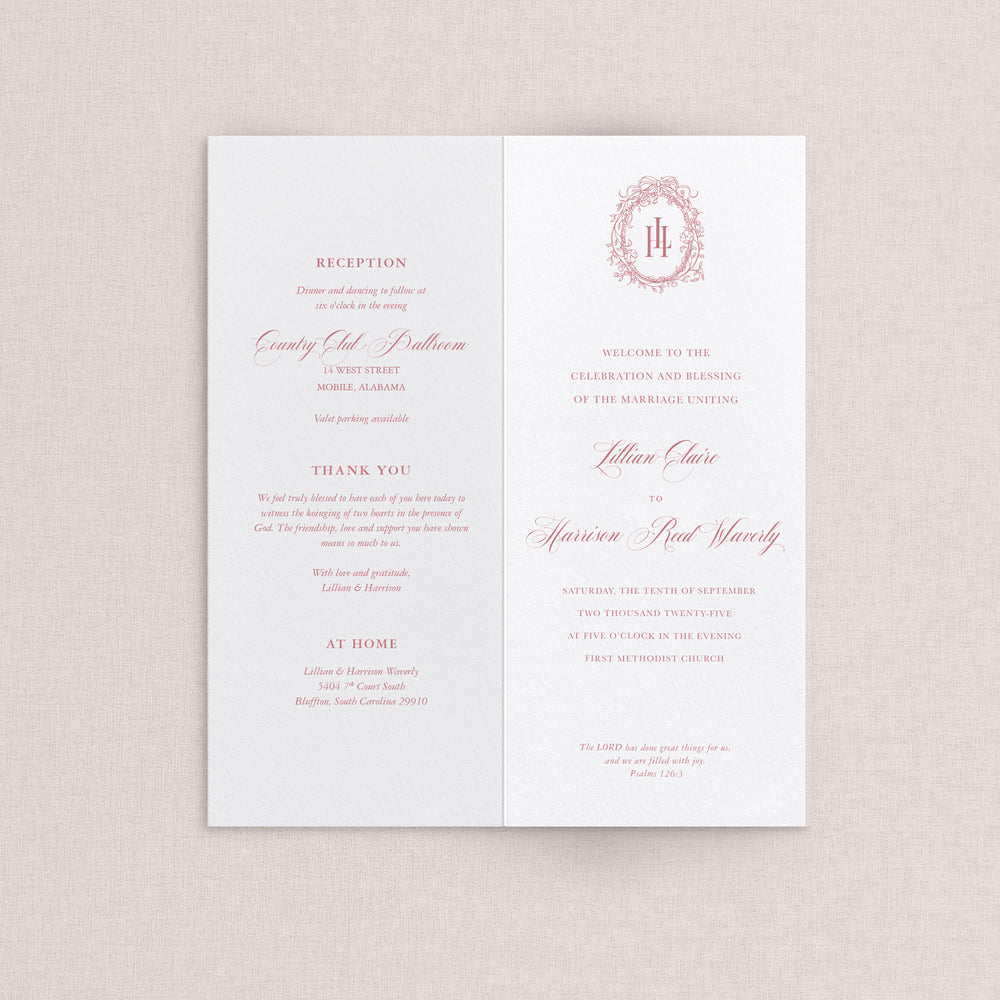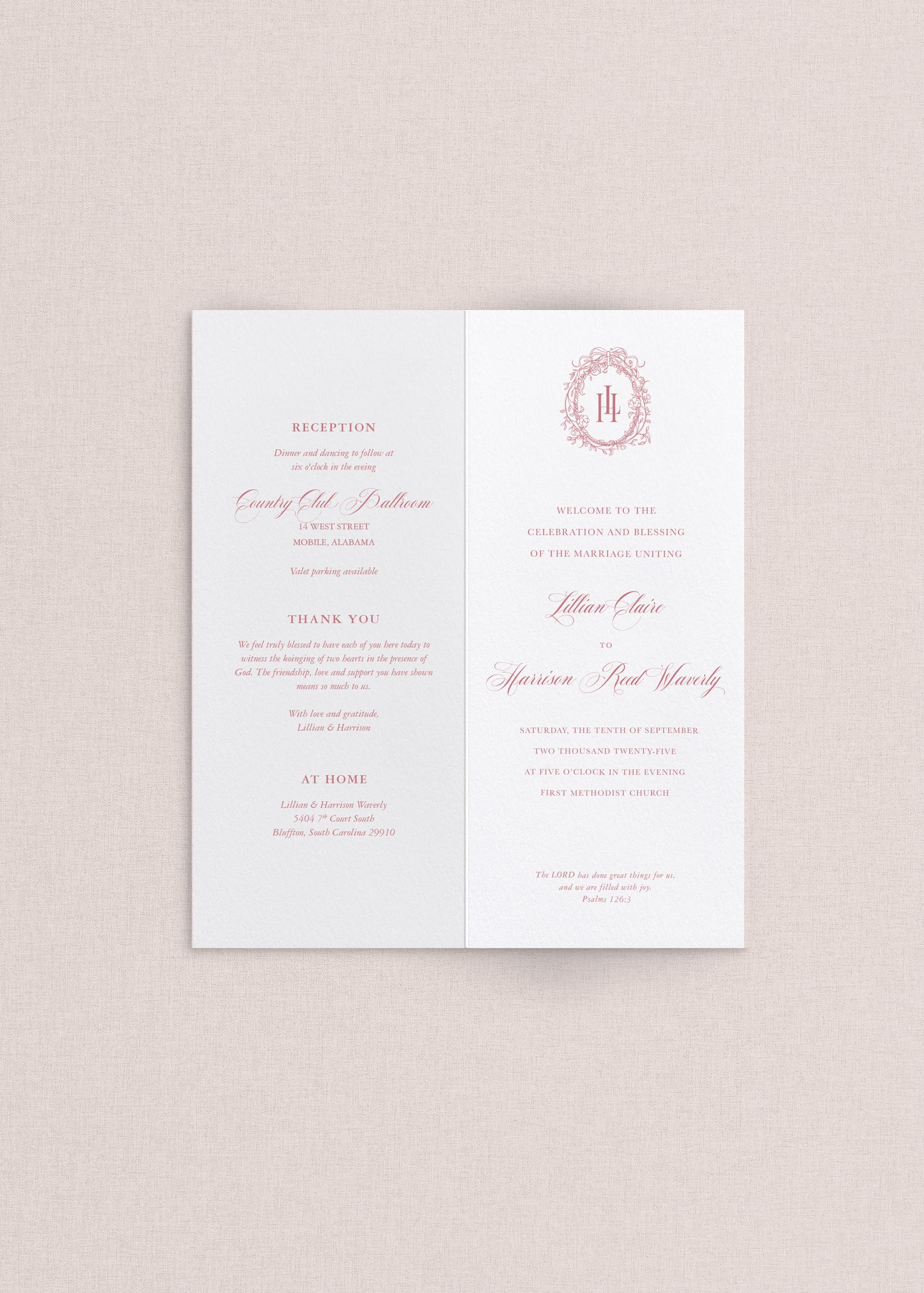 Introducing the Lillian Suite — a romantic design that captures timeless elegance with a soft, feminine touch. Featuring delicate rose motifs and flowing script typography, this suite exudes warmth and sophistication. Its graceful layout and gentle details create the perfect canvas for personalization, from custom monograms and envelope liners to thoughtful embellishments. With its romantic floral accents and elegant lettering, the Lillian Suite brings a sense of intimate, effortless charm to any wedding celebration.