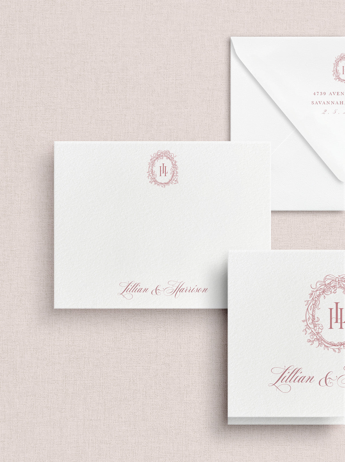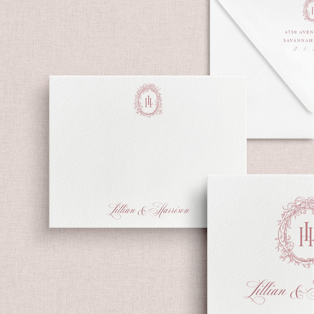 Introducing the Lillian Suite — a romantic design that captures timeless elegance with a soft, feminine touch. Featuring delicate rose motifs and flowing script typography, this suite exudes warmth and sophistication. Its graceful layout and gentle details create the perfect canvas for personalization, from custom monograms and envelope liners to thoughtful embellishments. With its romantic floral accents and elegant lettering, the Lillian Suite brings a sense of intimate, effortless charm to any wedding celebration.