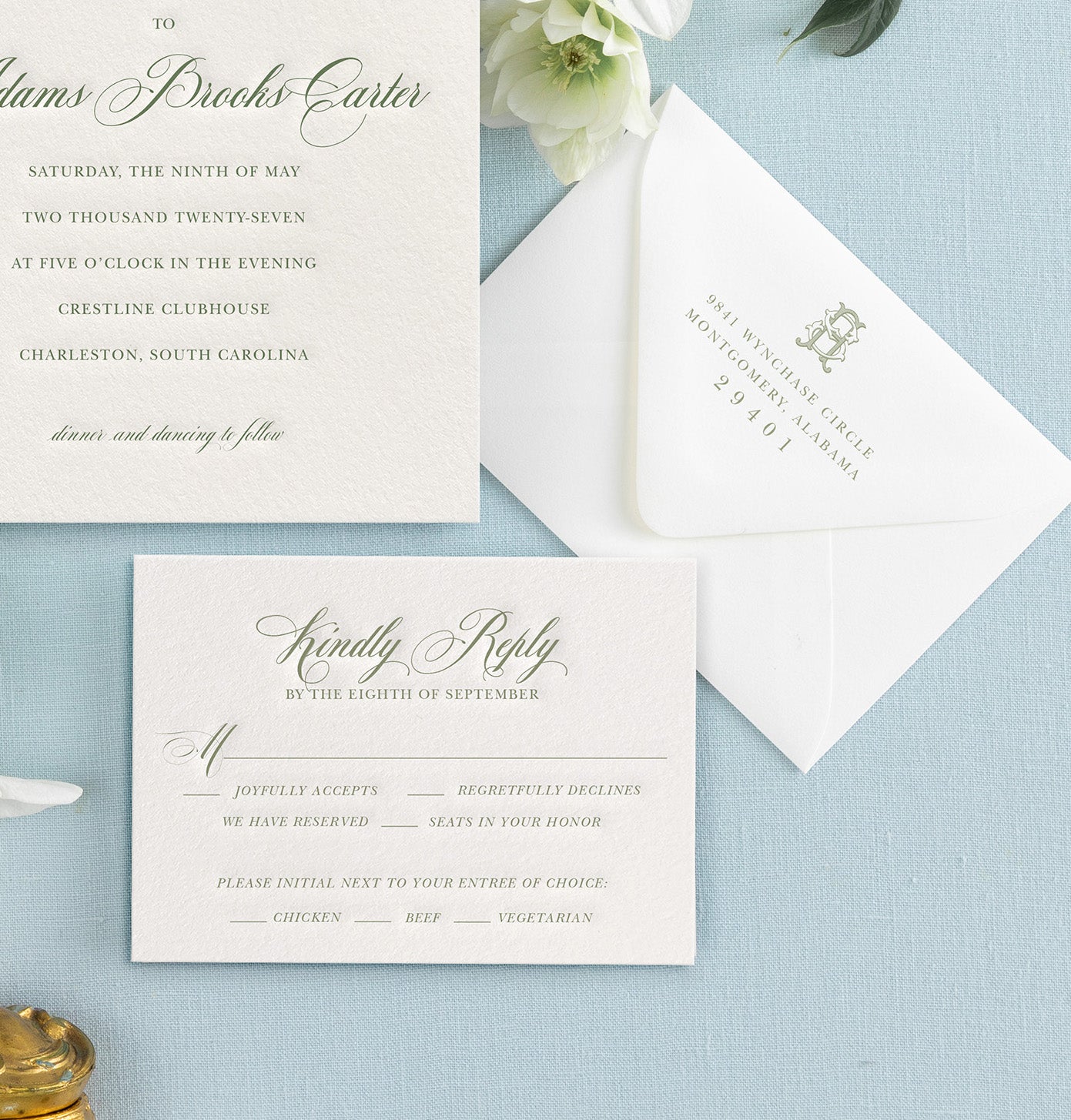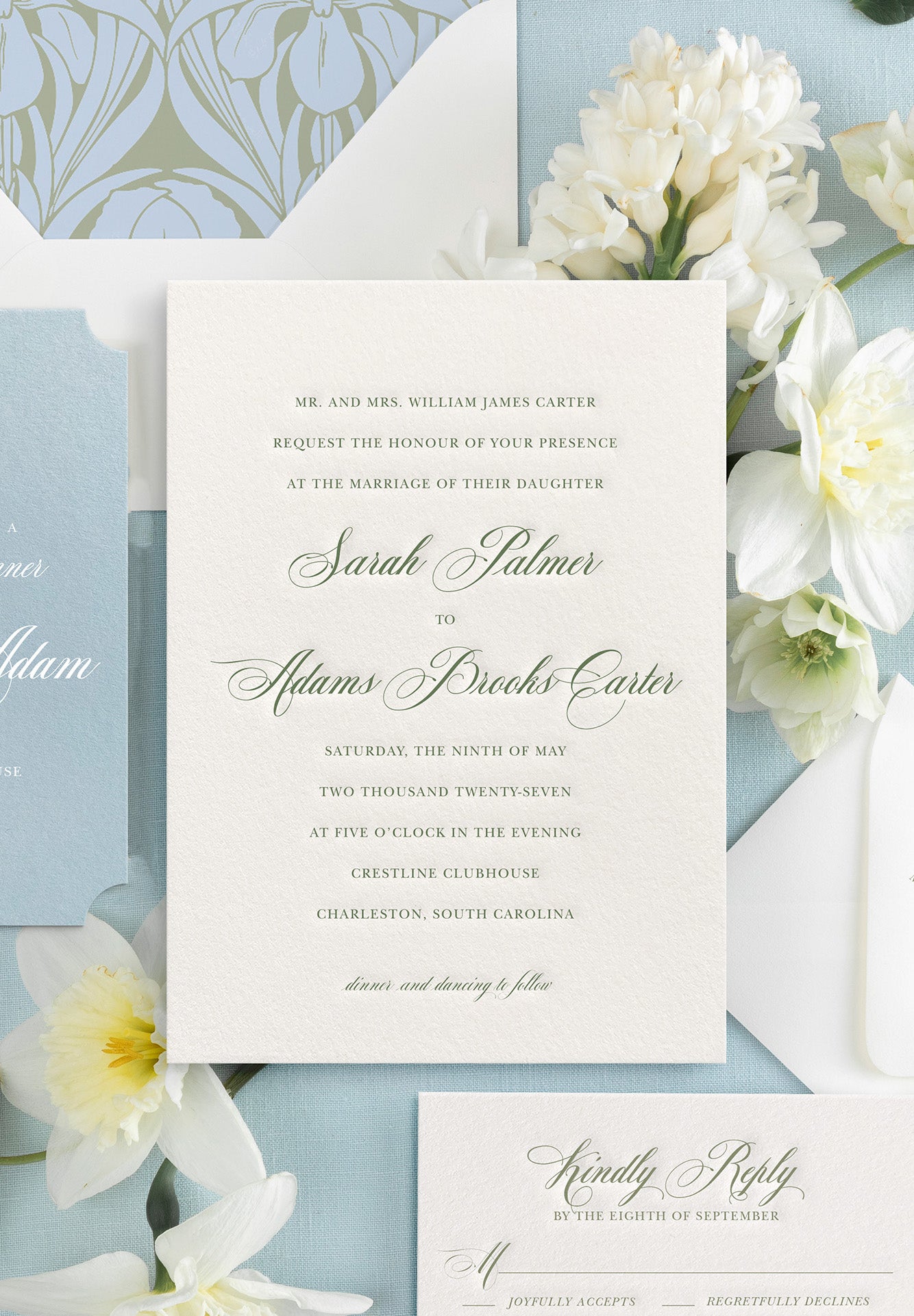 The Palmer Suite — a classic and airy design that captures timeless elegance with a fresh, refined sensibility. This suite features graceful typography, soft blue accents, and subtle botanical details that feel romantic yet composed. Thoughtful elements—from the patterned envelope liner to the coordinating inserts and envelopes—create a presentation that is polished and cohesive. Rooted in tradition with a light, coastal softness, the Palmer Suite offers an heirloom-quality design that will beautifully frame your wedding day for years to come.
