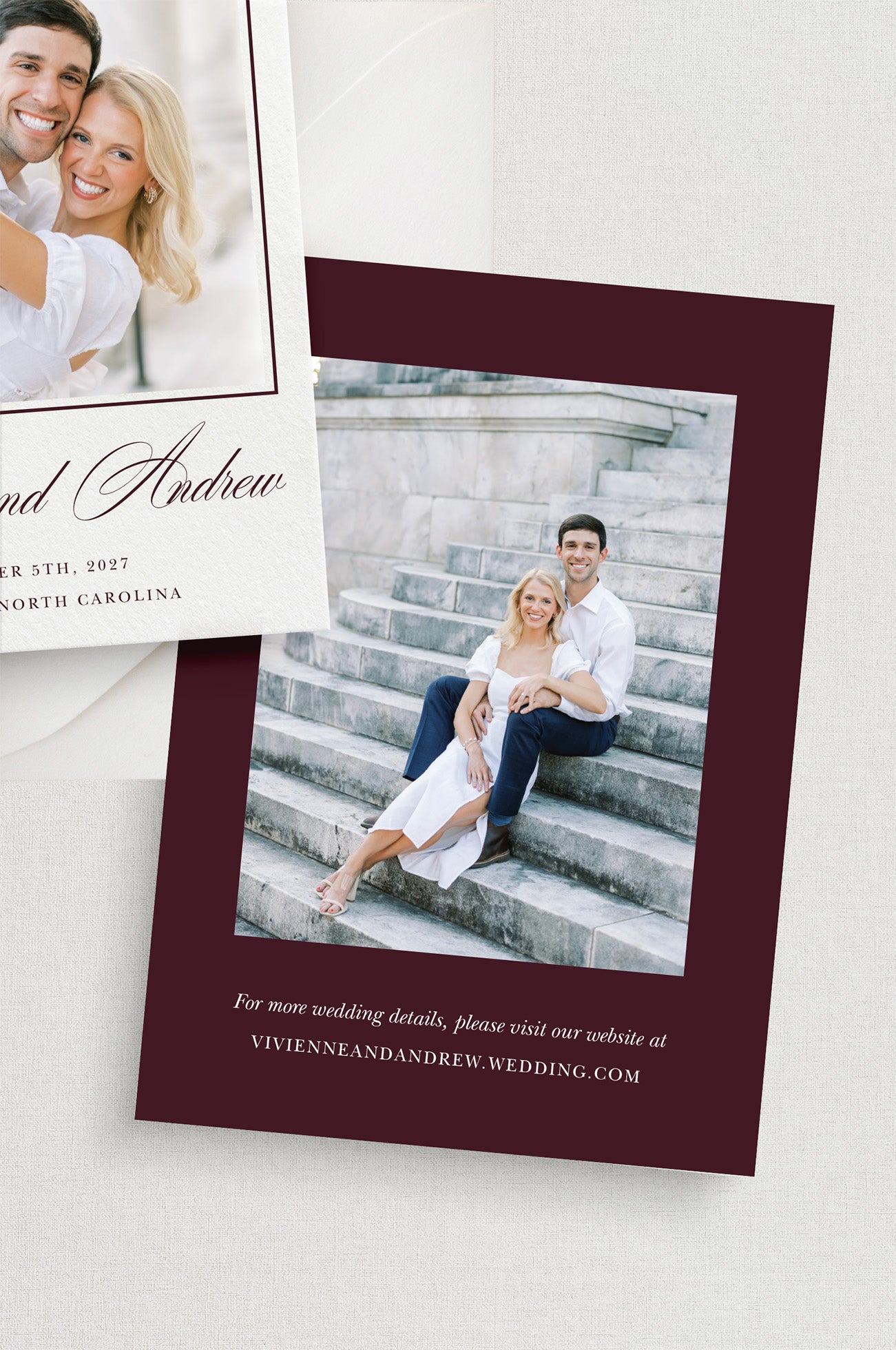 Our semi-custom process allows you to personalize key details while keeping the design cohesive and professionally styled. Choose your ink color and envelope color to create a look that complements your wedding palette and overall stationery suite.